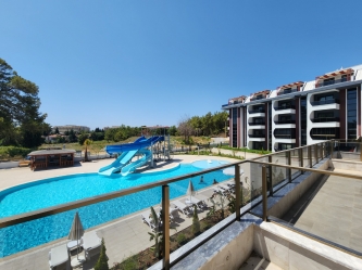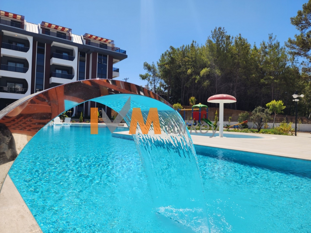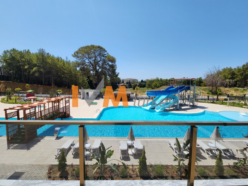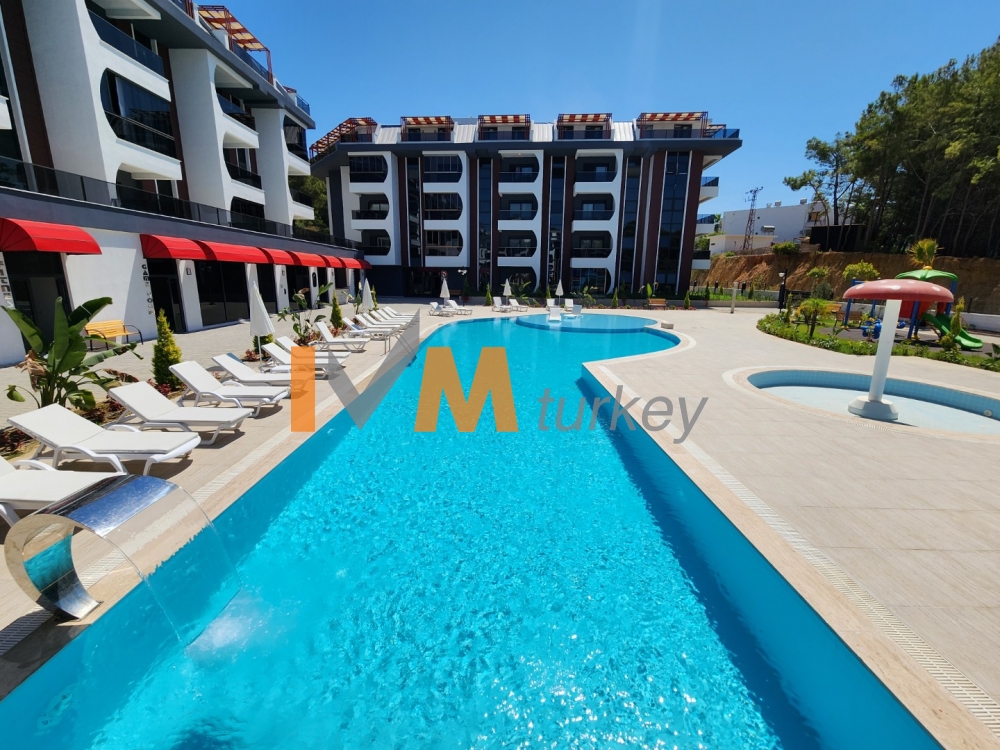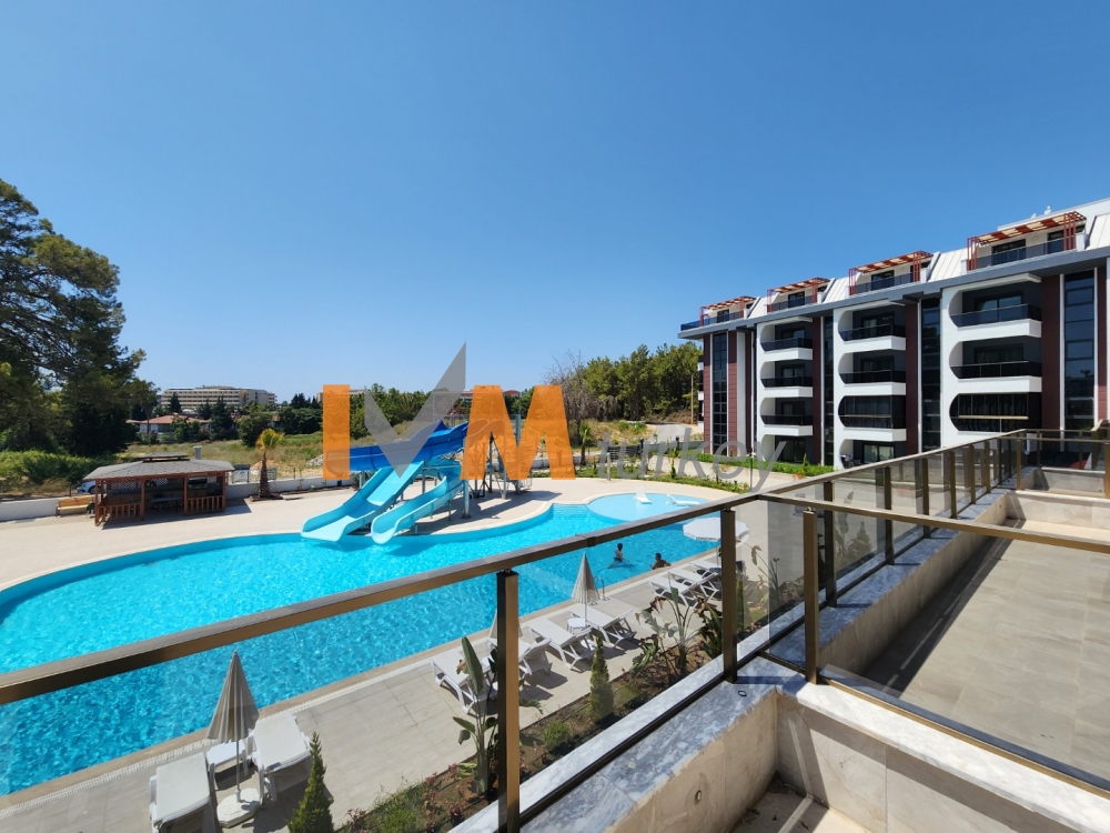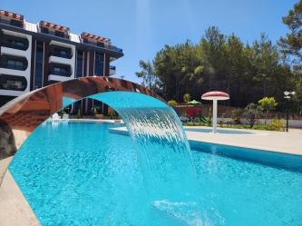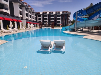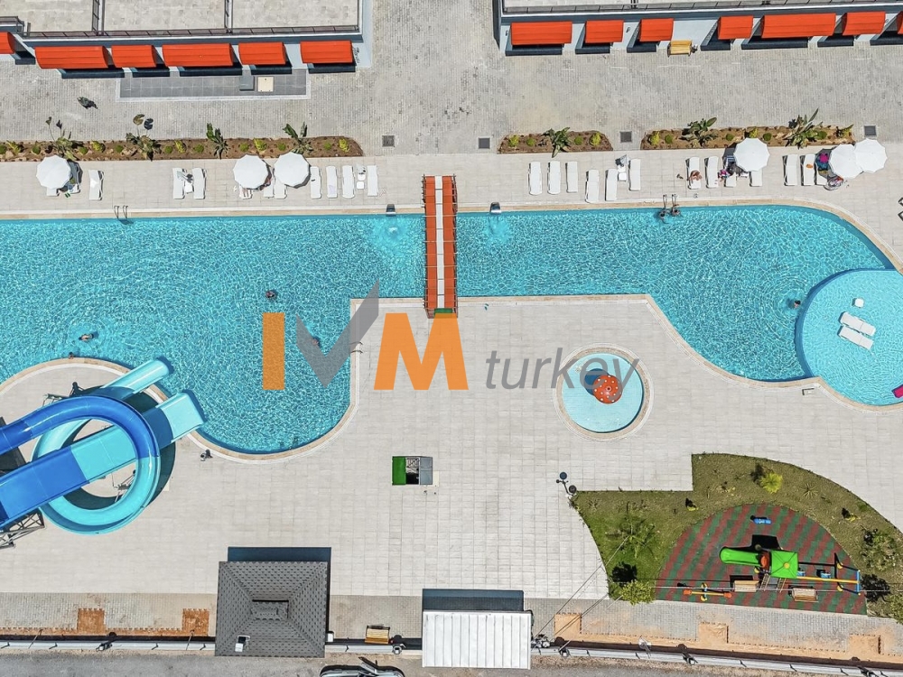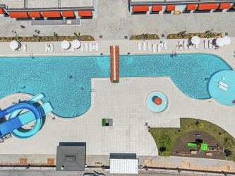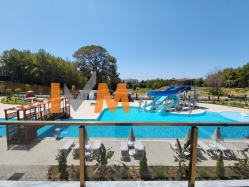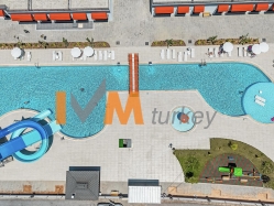 Outdoor swimming pool with decorative areas, jacuzzi and water park